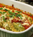 Two rolls of pasta filled with mix of cheeses, butter, fresh garlic, half & half, black pepper, oregano, fresh parsley, parmesan cheese, & melted mozzarella cheese. Served with garlic bread.